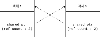 서로 다른 2개의 shared_ptr가 서로를 가르키고 있으면(순환 참조) 객체의 소멸 불가능하다.