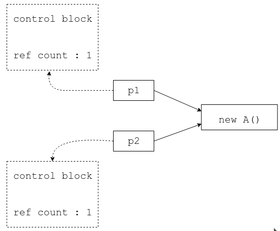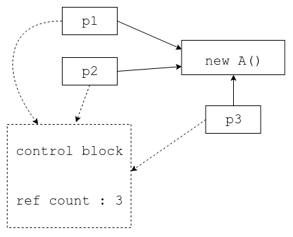 std::shared_ptr<A> p2(p1); // p2 역시 생성된 객체 A 를 가리킨다.
